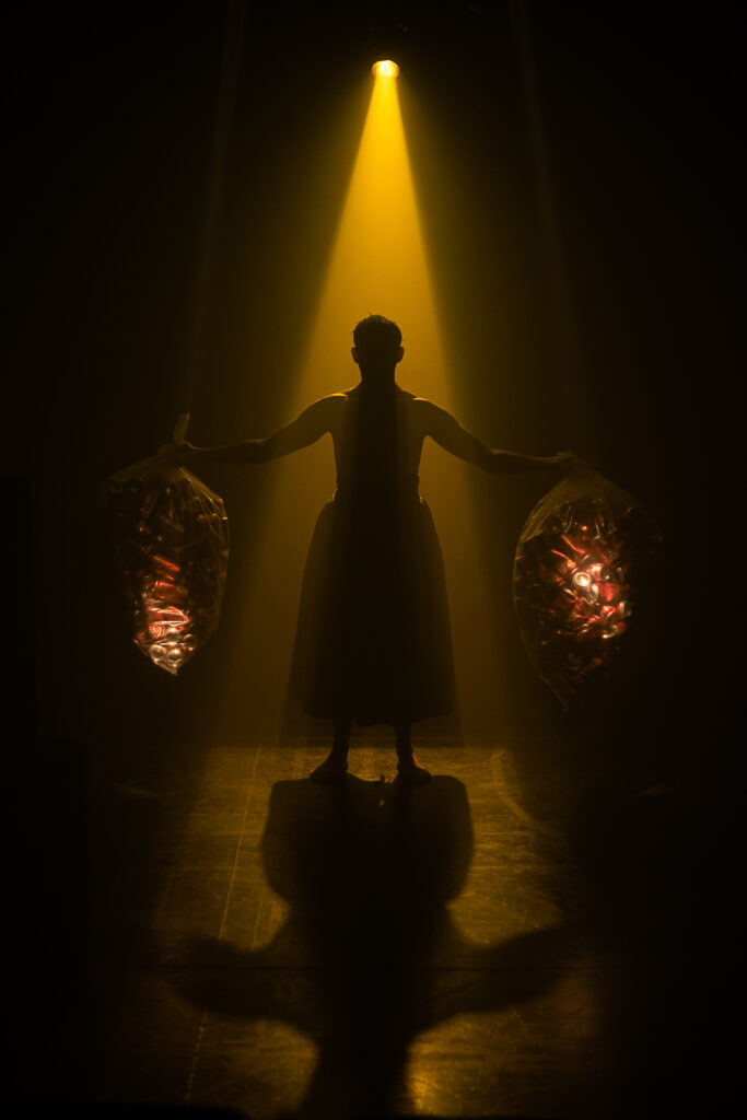 El monólogo de un pastero bajo un poste de luz que se prende y se apaga. Un hombre unido a ese poste de luz por metros de film plástico en una calle de Pudahuel. Parece la escena de una mal llamada detención ciudadana; arrinconado en la sala, rodeado por el público, el hombre –encarnado por Felipe…